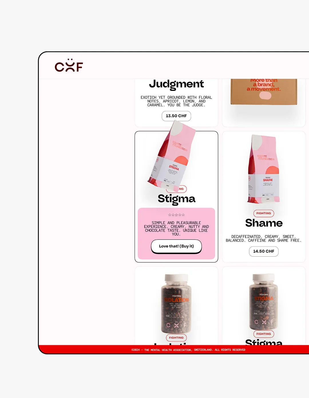 The website serves as the platform through which all our efforts engage and communicate Coffee Foundation's mission to the world. Beyond functioning as an ecommerce hub for product sales and a fundraising tool in the battle against mental illnesses, it stands as a beacon of awareness and support. It's a resource for individuals facing hardship or those seeking guidance on how to assist a loved one in need. The concept of pop design seeks to lighten the gravity of addressing such a complex topic. Its objective is to convey the message that mental illnesses are not a taboo to be ashamed of; rather, they are treatable conditions like any other illness. Open dialogue and support from loved ones are essential.