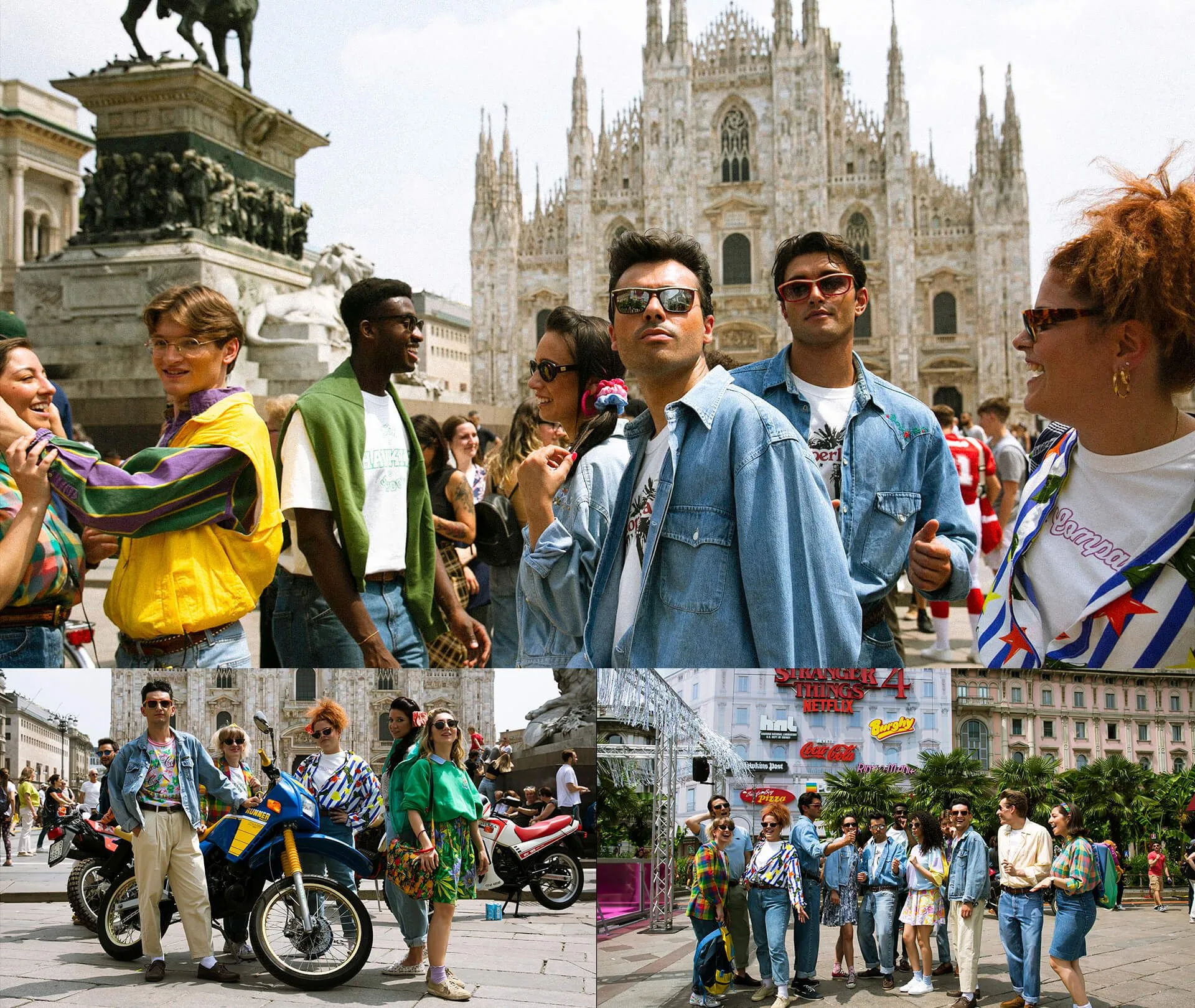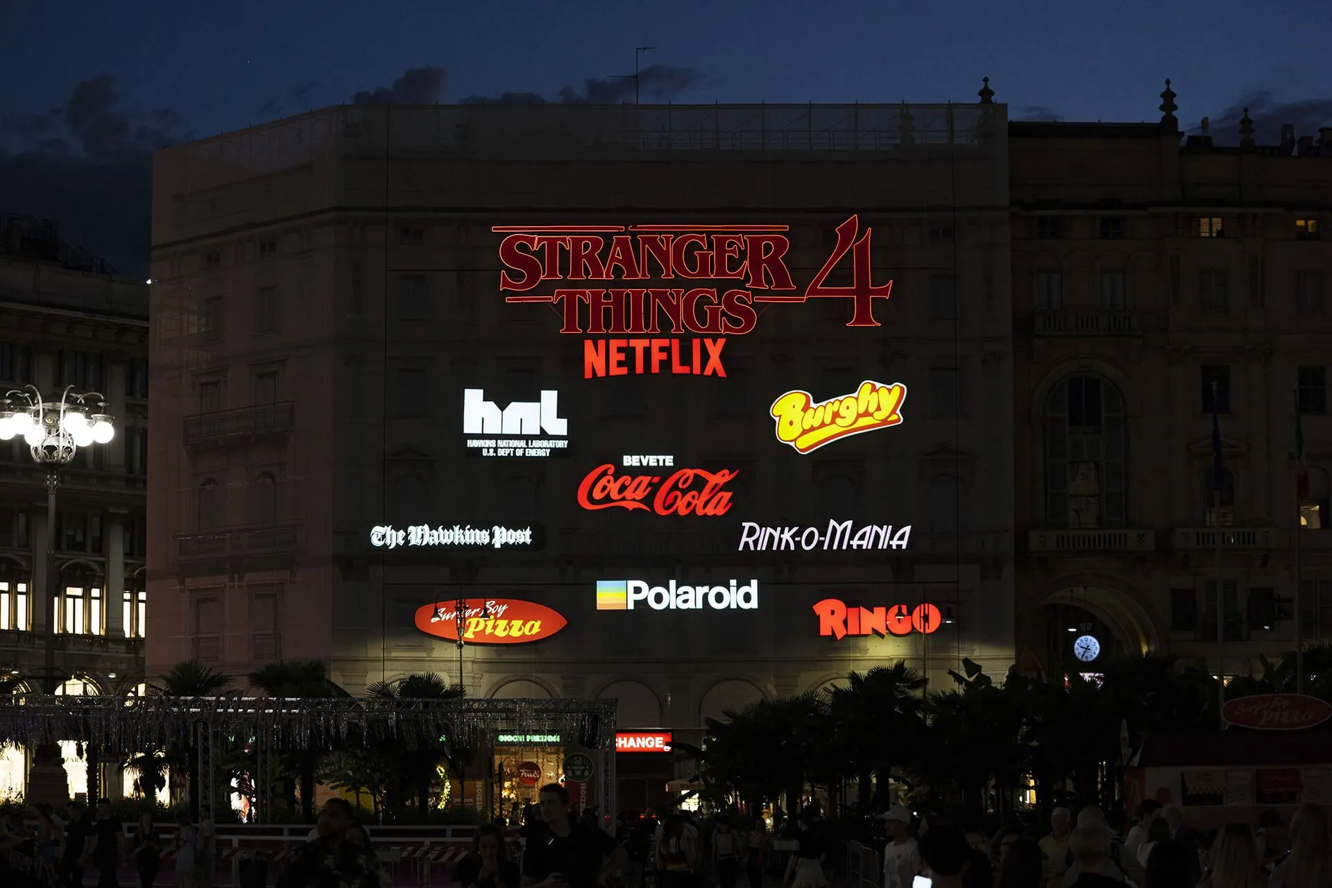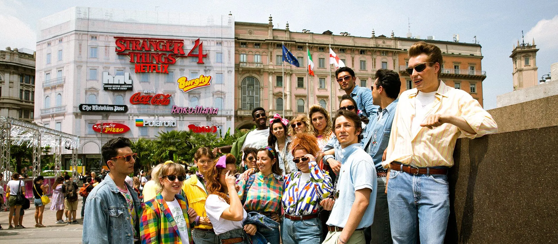 How we brought Milan Upside Down taking Piazza Duomo back in 1986 for Stranger Things 4 Italian launch. On May 26th Stranger Things fans were invited to an exclusive premiere of the first episode of season 4 in Piazza Duomo, the most famous place in Milan. During the screening, something really strange happened: an enormous rift appeared on the facade of Palazzo Carminati, the historic building in front of the Dome. Now that the gate is open, we were ready to announce an unexpected jump back in time to take the city center in 1986.