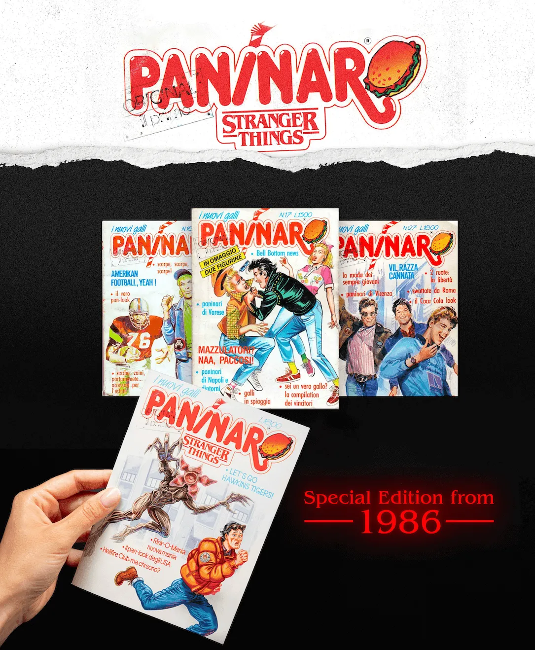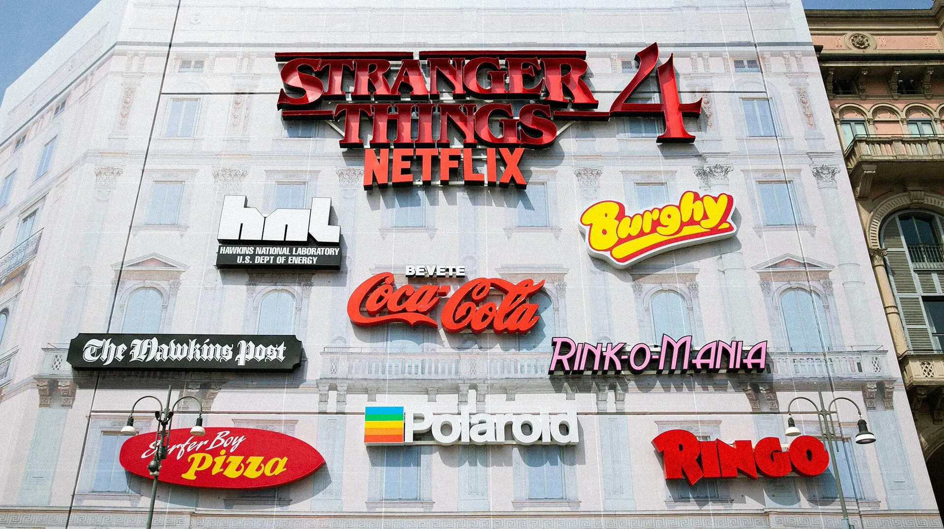 In the 80s in Milan, there were also many unforgettable brand signs on Palazzo Carminati facade. And we brought them back too, displaying some real brands - like Burghy, a popular 80s fast food that no longer exists - and others which belong to the Stranger Things 4 world.