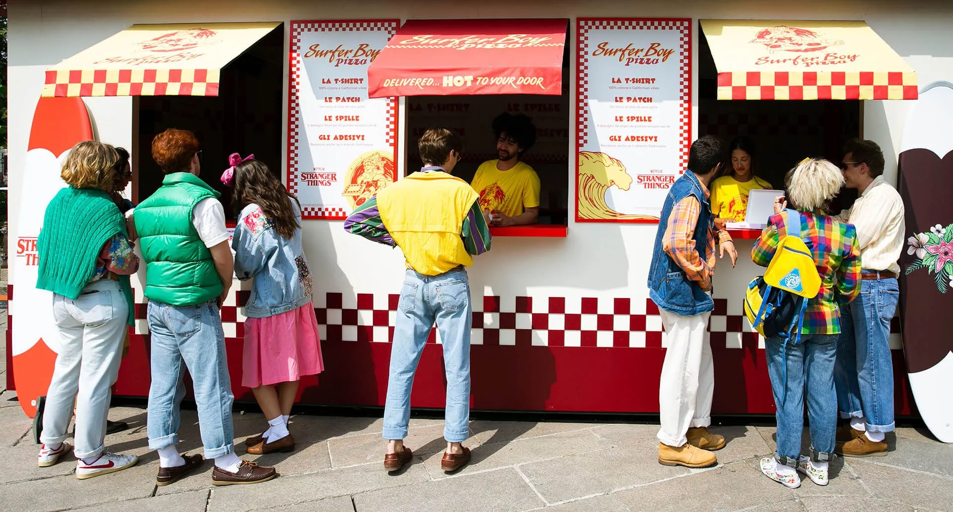 We literally carried Rink-O-Mania from California and we gave people the opportunity to skate with some professional roller-skaters, listening to the best 80s hits. Just like Mike and Eleven did in season 4. Another brand delivered hot right from California is Surfer Boy Pizza. The best meeting point for our paninari and for all the people who love fast food. Not even the hottest day on earth could stop fans from queuing hours to win fantastic gadgets inspired by the TV series.