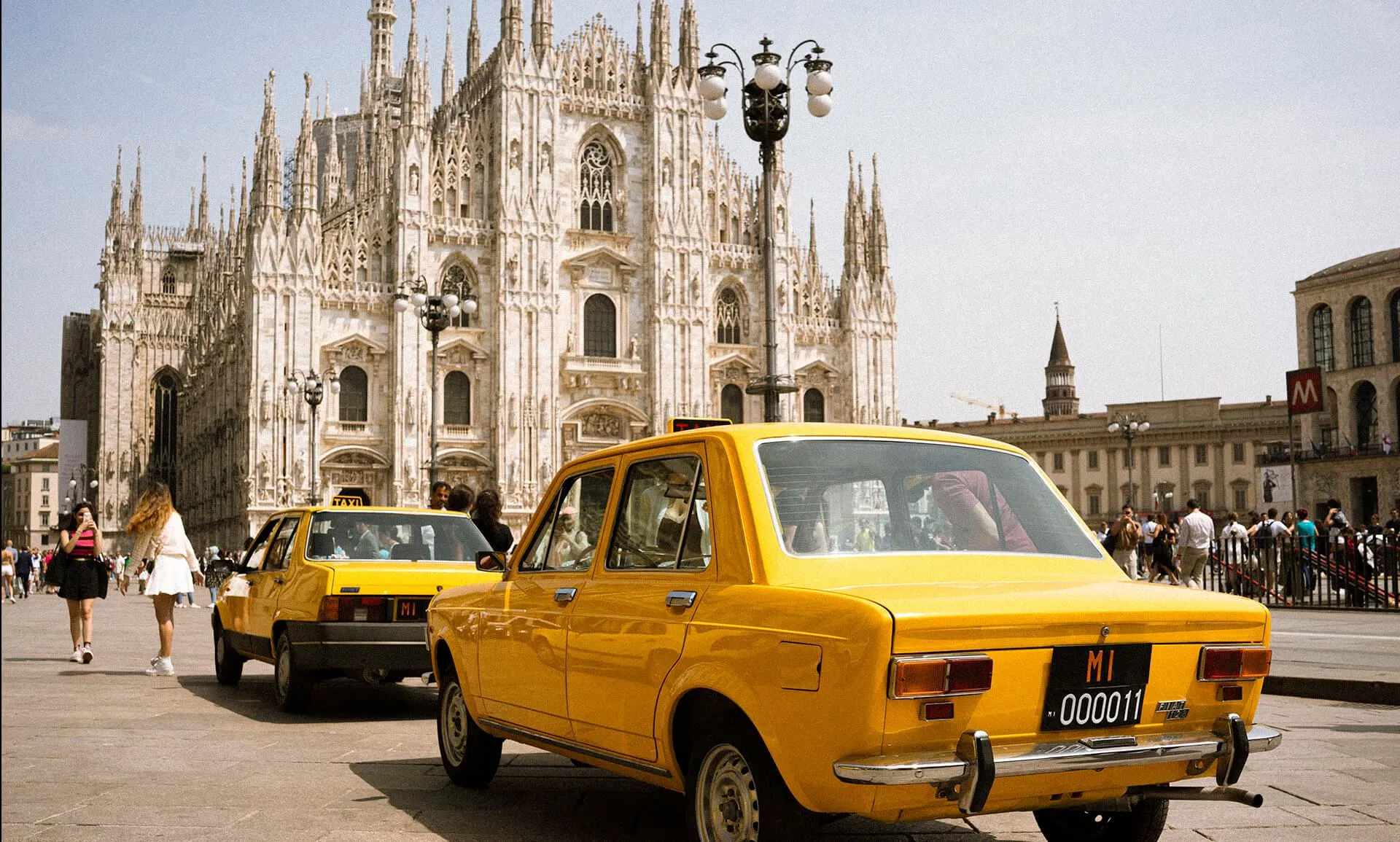 80s yellow taxis came back beside the square, exactly where they belonged in that period when cars could ride across the Duomo, but this time with a particular car license plate.